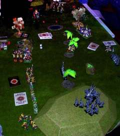 Um zehn Uhr gab es dann noch eine kleine Fragestunde und plötzlich wollten alle Leute, die vorher nur rumgestanden sind mitmachen.16 Teilnehmer (2 sind dann später noch dazu gekommen), viel mehr als wir erwartet haben. Bei der Fragestunde wurden dann noch ein paar wichtige Sachen geklärt. Irgendwie hatten die Echsenmenschen ihren Magierpriester vergessen. Keiner der Anwesenden hatte etwas dagegen (warum nur :) und so wurde kurzerhand ein Saurus Held zum General ernannt. Na ja, es soll halt auch intelligente Saurus Helden geben. Teilgenommen am Turnier haben folgende Armeen: